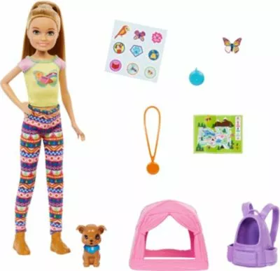 Zeit für Camping! Mit dem umfassenden und von der Barbie-Serie „It Takes Two!“ inspiriertem „Barbie It takes two! Camping’“ Spielset von Mattel geht es in die Natur. Die bezaubernde Stacie-Puppe hat sich ihr Outdoor-Outfit ausgesucht und trägt robuste Stiefel für die Tage in der Natur. Begleitet wird sie von dem süßen Hündchen, für das sogar eine Tragetasche vorgesehen ist. Die beiden haben alles eingepackt, was man für ein gemütliches Zeltabenteuer braucht. Mit dem Kompass und der Landkarten finden sie bestimmt einen tollen Zeltplatz. Mit in dem Set enthalten ist, neben Stacie-Puppe und Hündchen auch ein passendes Zelt für die beiden. Außerdem ist ein Stickerbogen für eine kreative und individuelle Gestaltung dabei. Für tolle Geschichten rund um die Outdoor-Abenteuer ist mit diesem Set gesorgt.