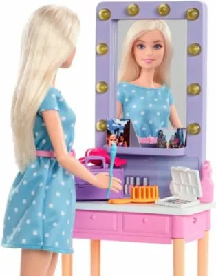 Die Big Dreams Malibu Puppe aus der Big City Reihe kommt mit einem Schminktisch sowie zahlreichem passenden Zubehör. Die Barbie mit langem, blondem Haar trägt ein leichtes Sommeroutfit und ist gerade dabei, sich an dem vollständig ausgestatteten Schminktisch zurechtzumachen. So ergeben sich zahlreiche Spielmöglichkeiten auch mit anderen Barbies sowie beim Spiel mit Freund*innen.