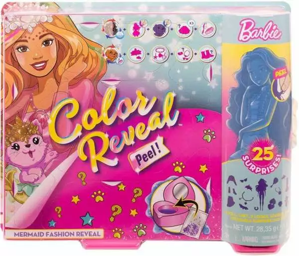 Diese Barbie Color Reveal-Puppe bietet das ultimative Überraschungserlebnis: ein Set mit 25 Überraschungen, 4 Farbwechsel-Effekte, ein Tier, zwei fantasievolle Meerjungfrauen-Looks, Glitzer und Schleim in einer herzförmigen Schatulle, eine Barbie-Puppe, ein Armband für Kinder mit zwei Anhängern und ein Sticker. Kinder können immer wieder fantasievolle Moden ausprobieren. Auch die Verpackung steckt voller Überraschungen: einfach die 16 Überraschungstüten von der Vorderseite der Verpackung abziehen. Eine der Überraschungstüten enthält eine mysteriöse Color Reveal-Puppe, die teilweise mit einer pinken Beschichtung bedeckt ist. Diese können Kinder entfernen, um das Aussehen der Puppe zu enthüllen, und die Überraschungstüten öffnen, in denen sich Kleidung und Accessoires für zwei Meerjungfrauen-Looks befinden. Die Überraschungen nehmen kein Ende … auch das Tier hat eine Beschichtung, die entfernt werden kann. Den muschelförmigen Schwamm in eiskaltes Wasser tauchen und das Gesicht, das Oberteil und die Haare der Puppe abwischen, um ihr Aussehen zu enthüllen. Farbwechseleffekte auf dem Gesicht des Tieres sorgen für einen zusätzlichen Wow-Effekt. Kinder können diese Farbwechsel-Momente mit kaltem oder warmem Wasser immer wieder neu erleben. Die vielen Überraschungen und Zubehörteile bieten Kindern Inspiration für zahllose Geschichten. Welche Puppe kommt zum Vorschein? Kinder können alle sammeln und kombinieren und so für noch mehr Spielspaß sorgen. Alle Artikel separat erhältlich. Die Puppe kann nicht von allein stehen. Abweichungen in Farbe und Gestaltung vorbehalten.