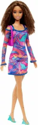 Diese besonders stylische Barbiepuppe aus der “Fashionistas”-Kollektion von Mattel sorgt bei Kindern für große Freude! Barbie trägt einen wundervollen Look, der aus einem Kleidchen im Marmordesign mit Zierausschnitten, einer schicken Schultertasche und grünen Pantoletten besteht. Ihr langes Haar hat dank des gekreppten Looks besonders viel Volumen und Barbies Sommersprossen kommen klasse zur Geltung. In diesem schönen Kleid geht Barbie gerne mit ihren Freund*innen abends aus!