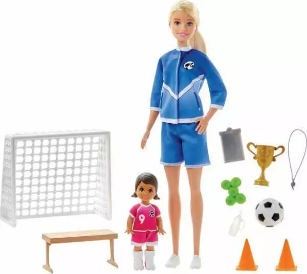 Mit Barbie und dem Fußballtraining-Spielset faszinierende Wettkämpfe erleben! Wenn Mädchen mit Barbie spielen, können sie alles werden, was sie sich vorstellen. Und wer gern Fußball spielt, kann sich als Fußballtrainerin versuchen! Dieses Spielset enthält Fußball-Zubehör sowie eine Barbie Fußballtrainerin-Puppe in blauem Fußballtrikot mit Stollenschuhen und eine niedliche Schülerinpuppe in pinkfarbenem Trikot mit Stollenschuhen.