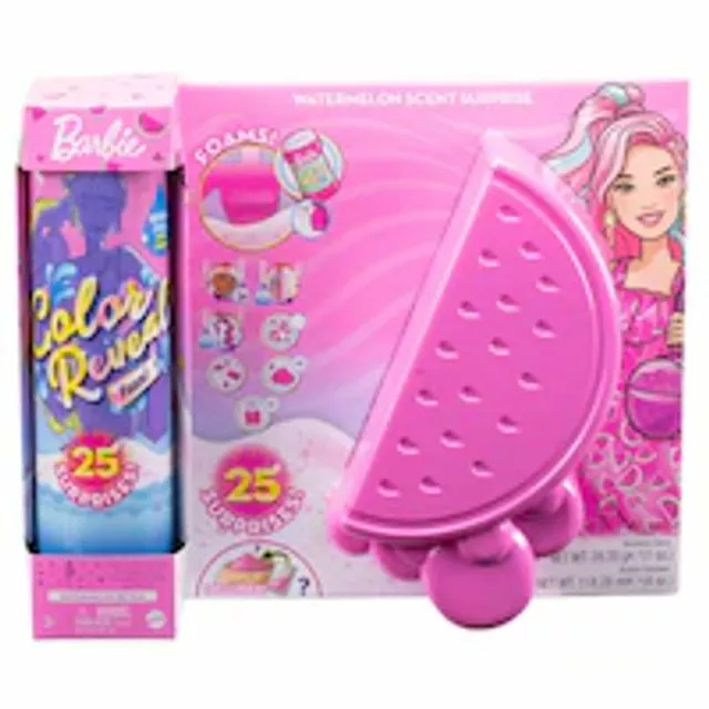 Barbie(r) Ultimate Color Reveal assortment deliver unboxing surprises with awesome sensory play! A doll wearing a trendy fashion is guaranteed, but each doll’s look remains a mystery until revealed. Simply pour the scented bubble solution into the included tube until foam forms revealing the Barbie(r) Color Reveal doll! The packaging is part of the fun — use the fruit-shaped blister as a foam pool, filling it with the foaming bubble solution after the big reveal, and add some water for an awesome foam pool party! The assortment uses three different fruit themes — pineapple, watermelon, and strawberry — with 25 surprises such as hair extensions, outfits, a sun umbrella, sand box and kinetic sand in each. There’s also a hidden charm that girls find in the sand that attaches to the included bracelet. Each doll has a different combination of hair, skin tone and swimsuit. Dress the doll up and play out a story. Use the tube to store the Barbie(r) doll and fun surprises. Kids can collect them to mix and match accessories, gather all the hidden charms and expand the possibilities! Includes Barbie(r) Color Reveal doll, fashion and accessories.