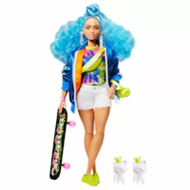 Barbie(r) Extra dolls dial it a level up with bold fashion choices and over-the-top personalities rivaled only by their pets, showing that style is a state of mind. All the Barbie(r) Extra dolls are posable with articulated bodies, include pets that are also “extra” and have more than 10 plussed-up fashion and accessory pieces. Each doll also comes in a unique package — not only is the structure break-frame with bold colors throughout, but each box will also include a unique tactile element, like the fabric from Barbie(r) doll’s jacket, confetti inside the icon and silver holographic foil in the logo.Includes Barbie(r) Extra doll wearing fashions and accessories, plus pet and pet accessory.