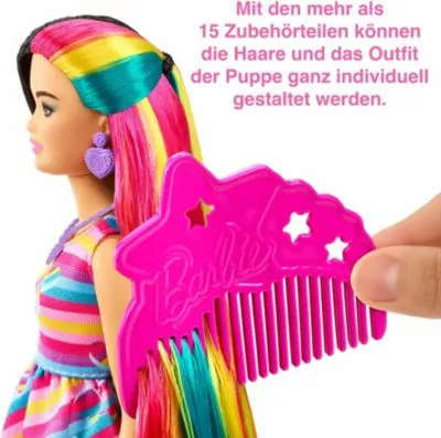 Barbie liebt kreative Outfits und besondere Frisuren! Mit dieser bezaubernden Barbie „Totally Hair Puppe“ von Mattel können viele Geschichten von kreativen Styling-Abenteuern erfunden werden. Die bezaubernde Barbie begeistert in einem ärmellosen Kleid im Herzchen-Look mit den passenden Schuhen und vielen Accessoires. Das kuschelige zusätzliche Oberteil und die Herz-Haarclips sind eine perfekte Ergänzung zu dem Kleid und laden zum Spielen und Geschichtenerzählen ein.