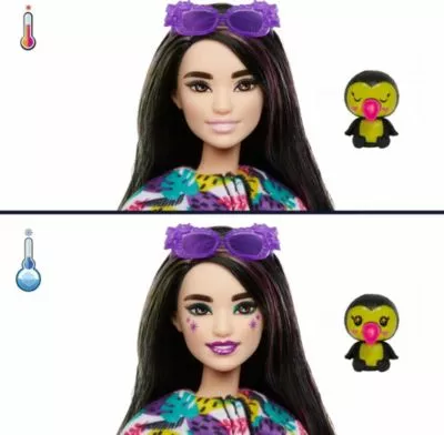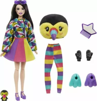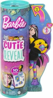 Hier kommt eine bezaubernde Schönheit! Barbie begeistert in einem ganz bezaubernden Outfit und hat ein niedliches Tierkostüm dabei. Mit der Barbie Cutie Reveal aus der Jungle-Serie – Toucan geht es zur Verkleidungsparty. Die Barbie hat sich das Gesicht geschminkt und das Kostüm mit einem flauschigen Oberteil, einer kuscheligen Hose und ergänzenden Füßchen wird alle Fans toller Kostüme begeistern. In dem Set enthalten ist außerdem ein kleiner Tierbegleiter und ein Kamm. Die langen Haare können natürlich nach Herzenslust gestylt werden. Für alle Sammler*innen ist diese bezaubernde Lady ein Muss in der Barbie-Kollektion. Sie hat bewegliche Gelenke und kann sich in allerhand verschiedene Posen werfen.